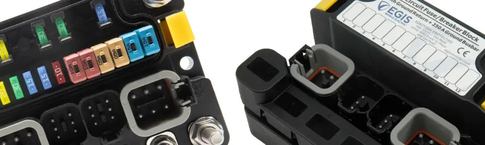 Eight ATO fused outputs with MX-150 plug/play connectors plus two LP JCase fused outputs with screw terminals. Designed for harsh environments.